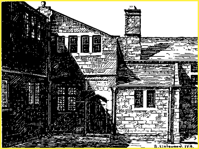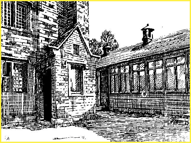 This drawing by Edward Akroyd shows the original entrance to the School, in the