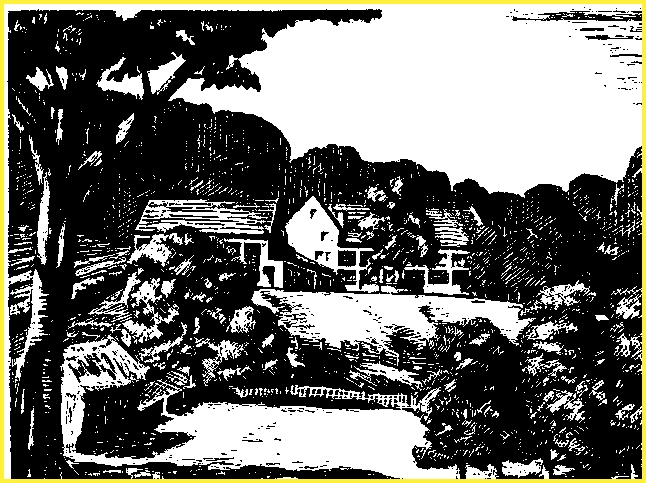 An attractive scraper board drawing by Brian Littlewood shows Fenay Quad - a
