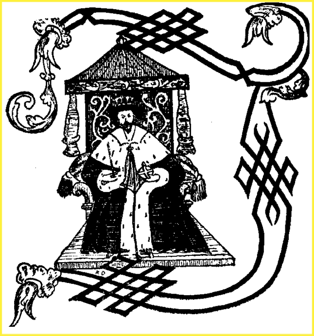 This drawing by Roger Dowling of James I on his throne is taken from the