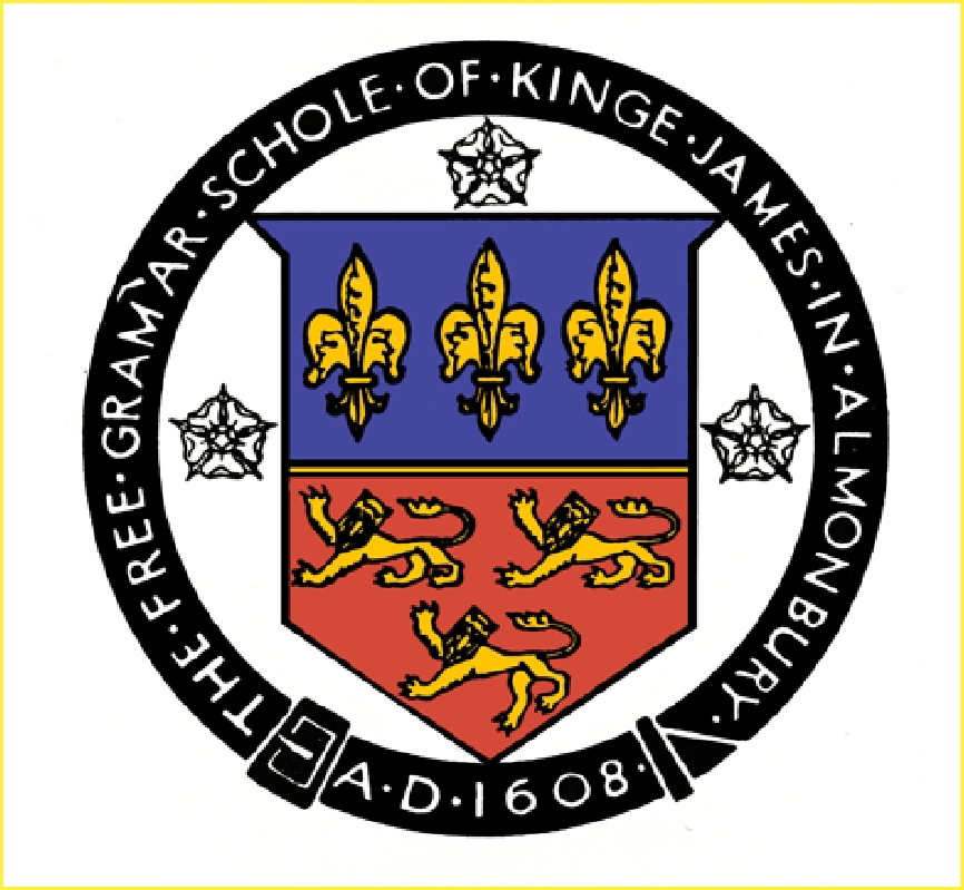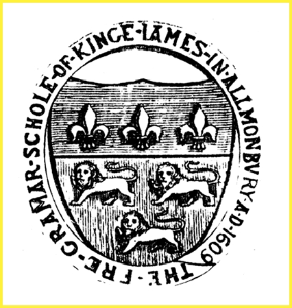 carried the incorrect date 1609; note also the incorrect wording ‘YE GRAMAR SCHOLE OF KINGE JAMES IN ALLMONBURY’. The original artwork was by Art master Edward Akroyd.